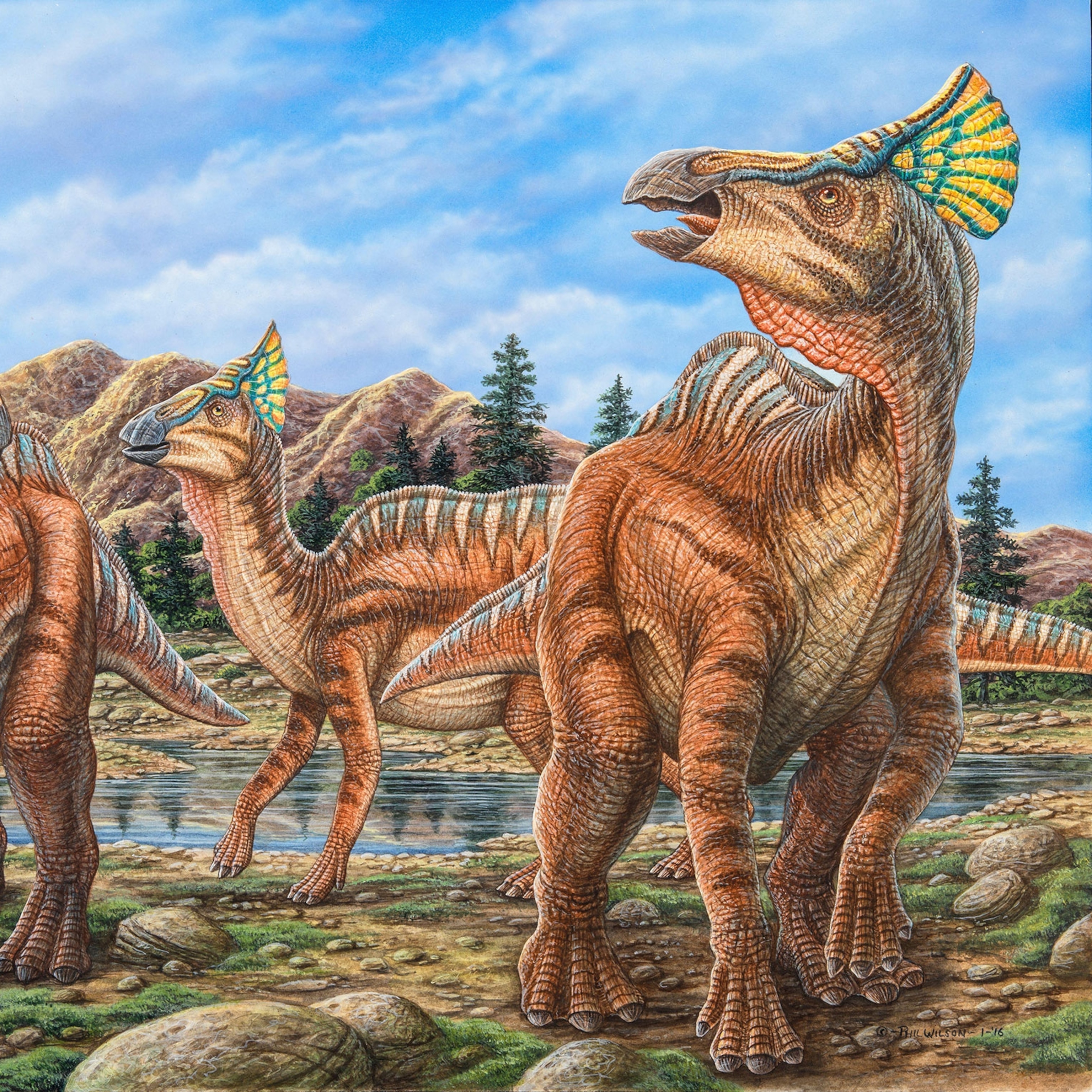 “The shoreline is an unusual place where you can look down and see a quarter of a mile,” says Sereno. Perhaps these standout features, which are similar to the head crest of today’s helmeted guineafowl, broadcast something to potential mates or rivals. Though the researchers say, at this point, it’s unclear if there were differences between S. mirabilis males and females.
